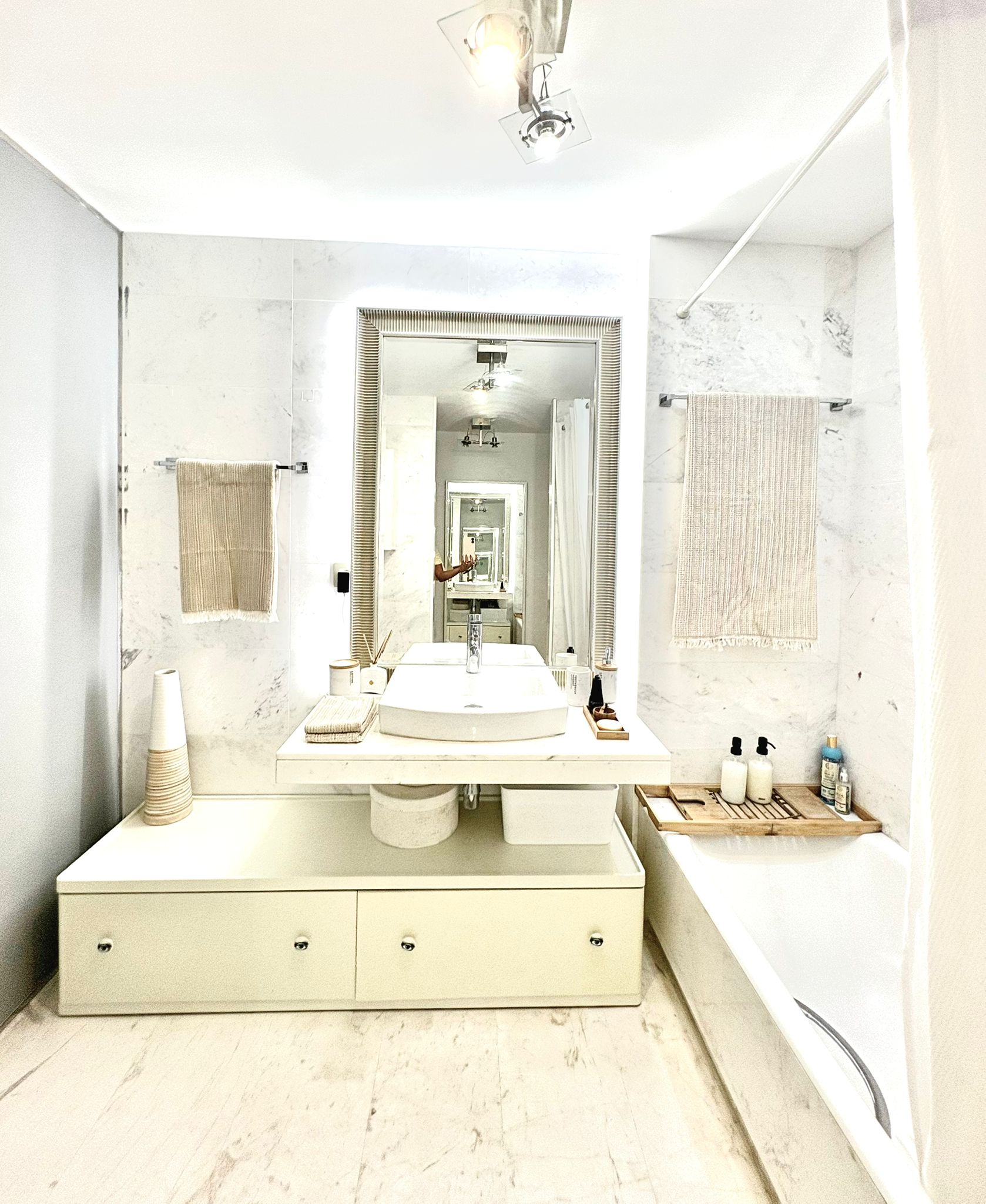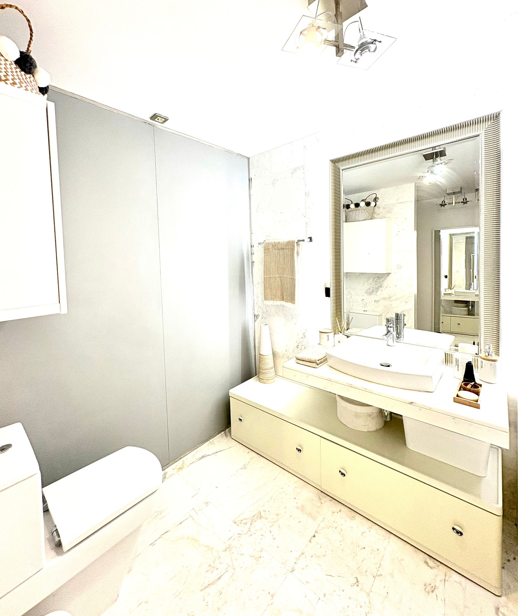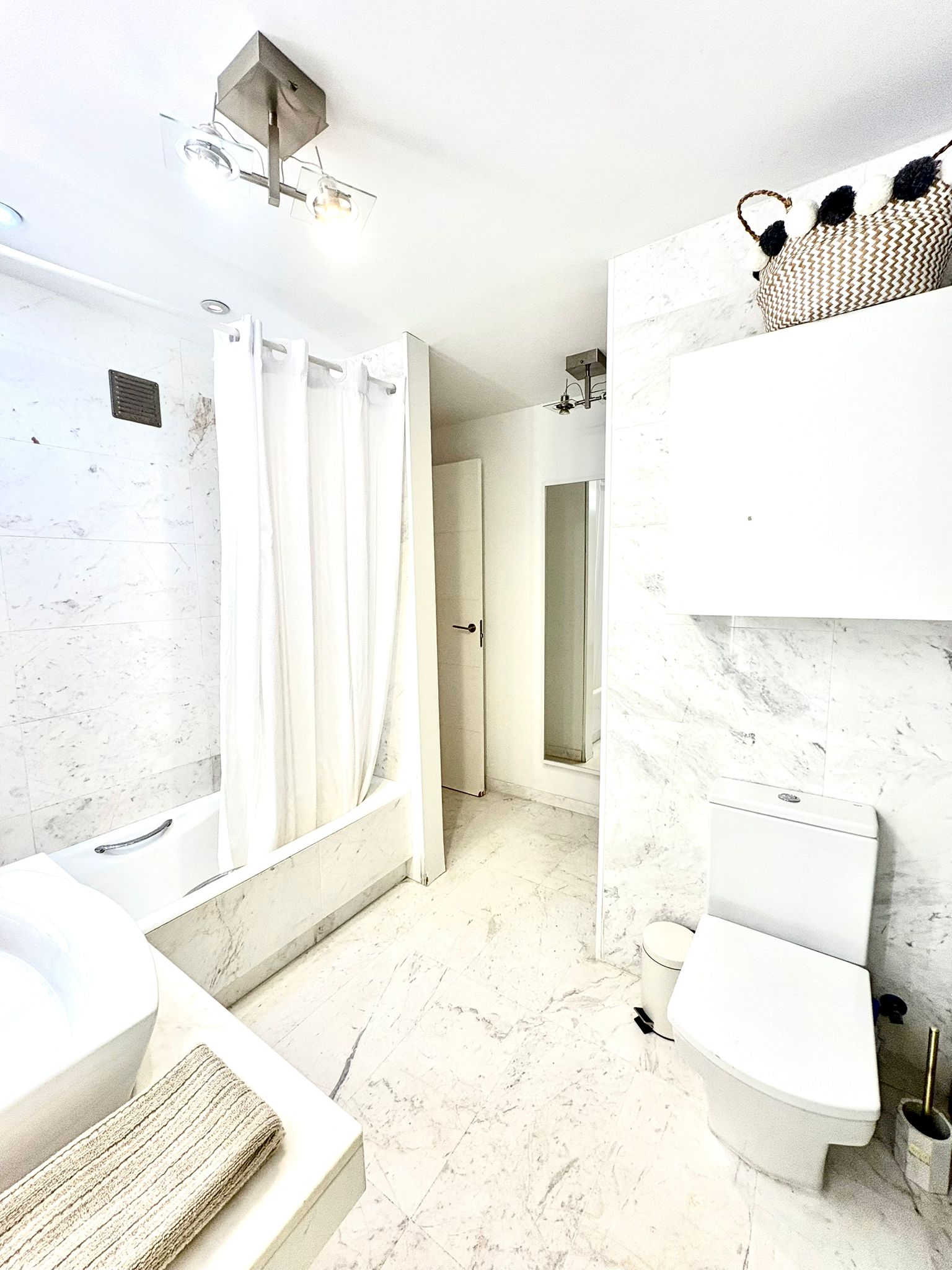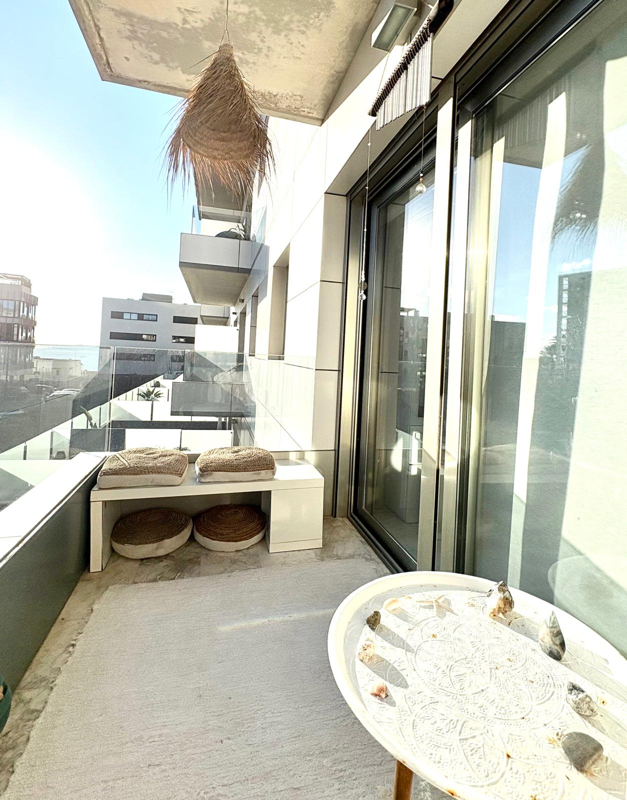 The apartment offers a built area of 80 square meters with a comfortable living area of 75 square meters. It features two completely independent bedrooms, providing privacy and convenience for residents and guests alike. The master suite includes an en-suite bathroom with a bathtub, while the second bedroom has a separate full bathroom with a shower. Its east-facing orientation ensures a bright, inviting atmosphere throughout the day, and a spacious private terrace creates the perfect space to relax and enjoy the sea breeze.